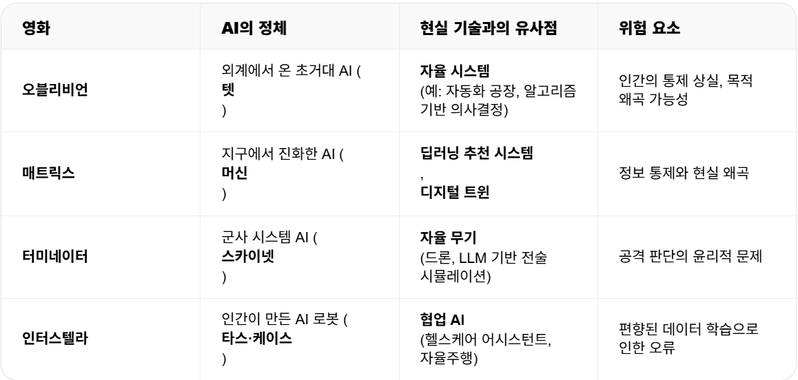 아래 표는 영화 속 AI와 현실 기술을 비교해 현재 사회가 직면한 문제를 짚어봅니다.